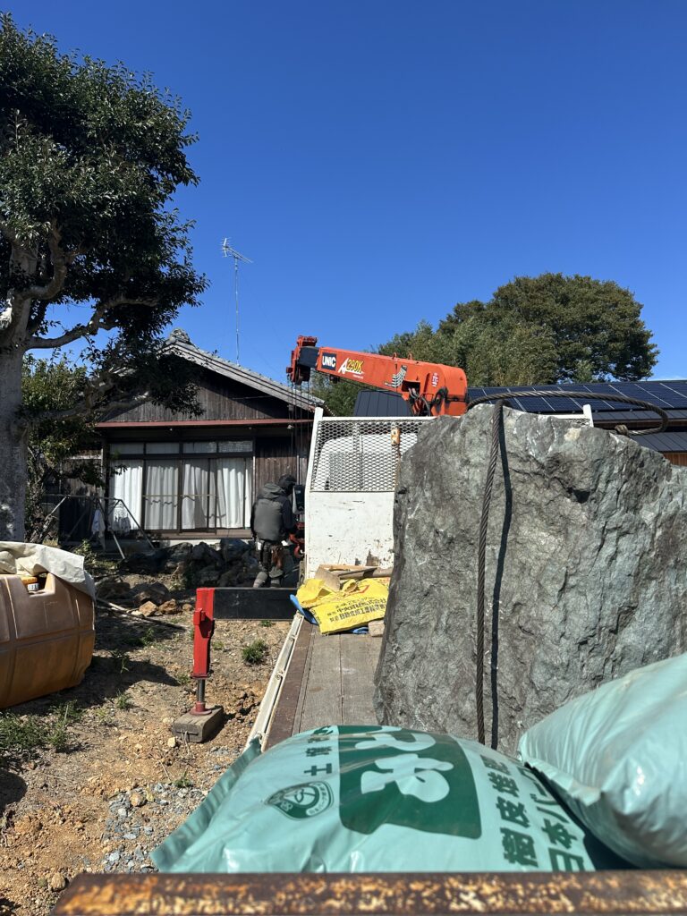 元々のお庭にあった石の再利用ですが、石が大きいのでユニック車でもなかなか大変な工事。