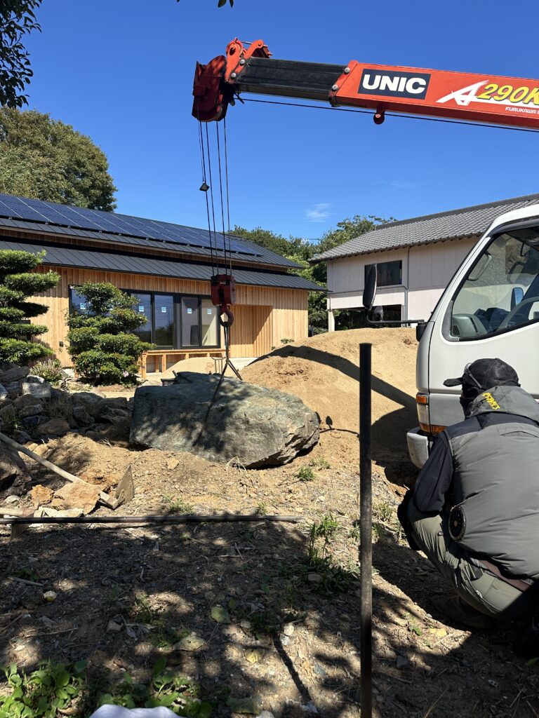 外部では外構工事がすすみ、現在は造園工事の初期となる景石設置が進んでいます。