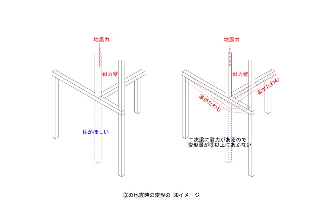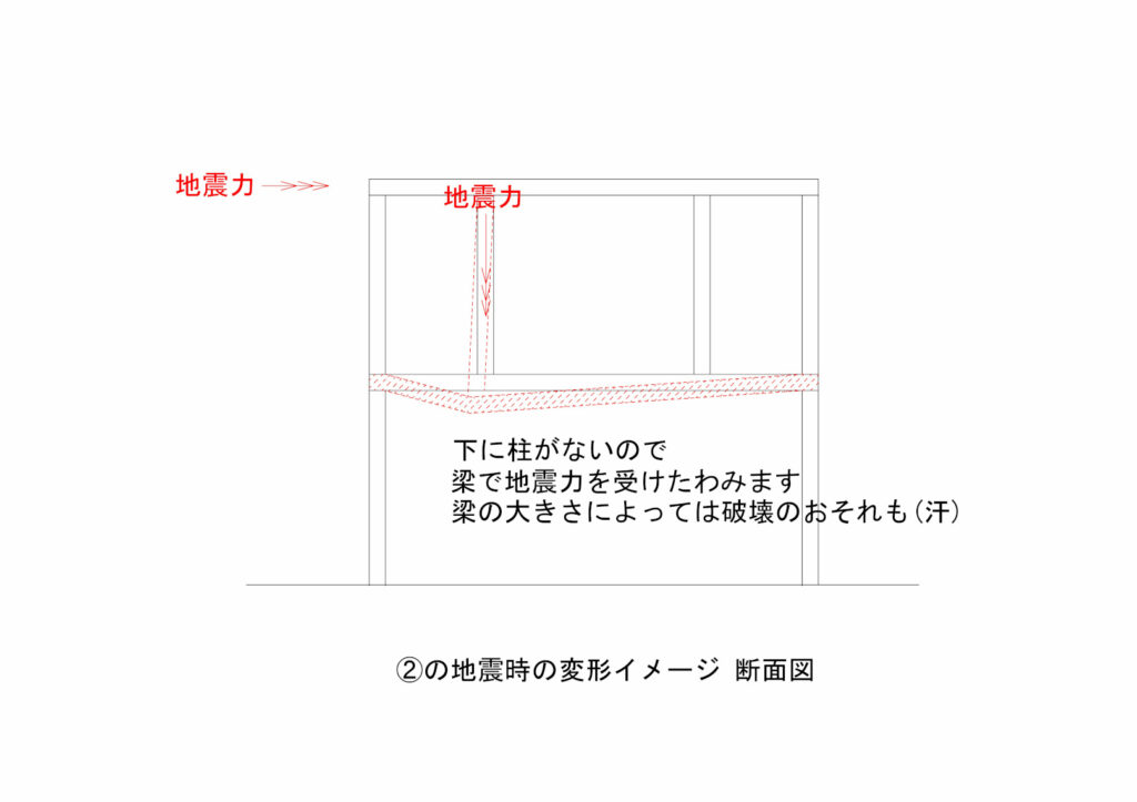 だから地震時のたわみ方は②の梁以上にあぶない状態になります。