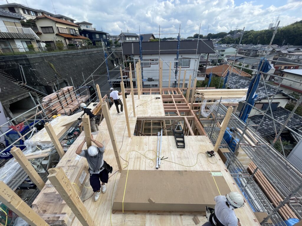 上棟作業は朝8時から開始。普段の弊社の物件よりも少し大きいため早めにやりたい気持ちはありますが、ご近所の迷惑になってしまうので8時開始は厳守です。