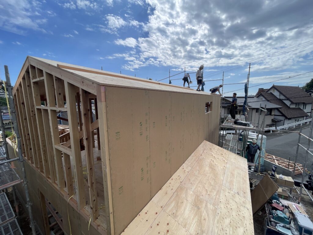 なんとか…ではありましたが無事屋根の野地板工事を終え、屋根ルーフィング(屋根の防水)まで敷くことが出来ました。