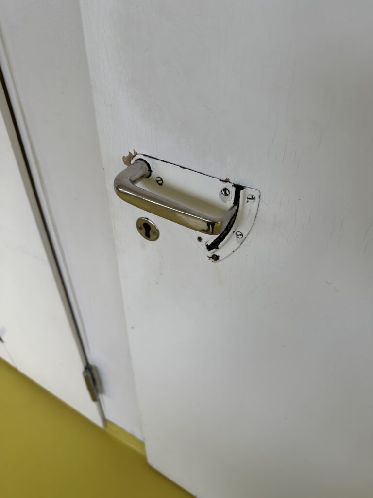 患者さんが袖をひっかけないように配慮されたテスリやドアノブたち。