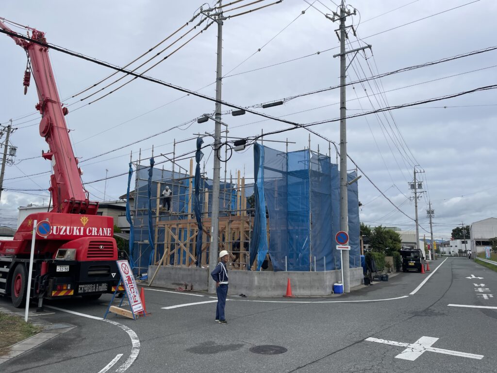 ご実家のお隣りの敷地へ建てますので、いつもよりも敷地に余裕がないため通行止めにしながらの作業となりました。