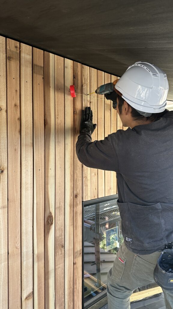 スギ材は全てがまっすぐな品物ではないため、外壁に貼る際の目安となる墨付けをしましたが大工さんは丸2日かかったそうです(汗)