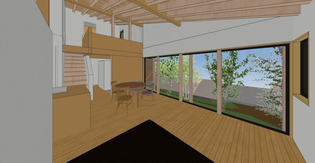 借景ではないですが、木陰をくぐるアプローチ兼雑木庭を毎日眺めていただきたいと考え、リビングダイニングキッチンからの眺めは全面開口とさせていただきました。