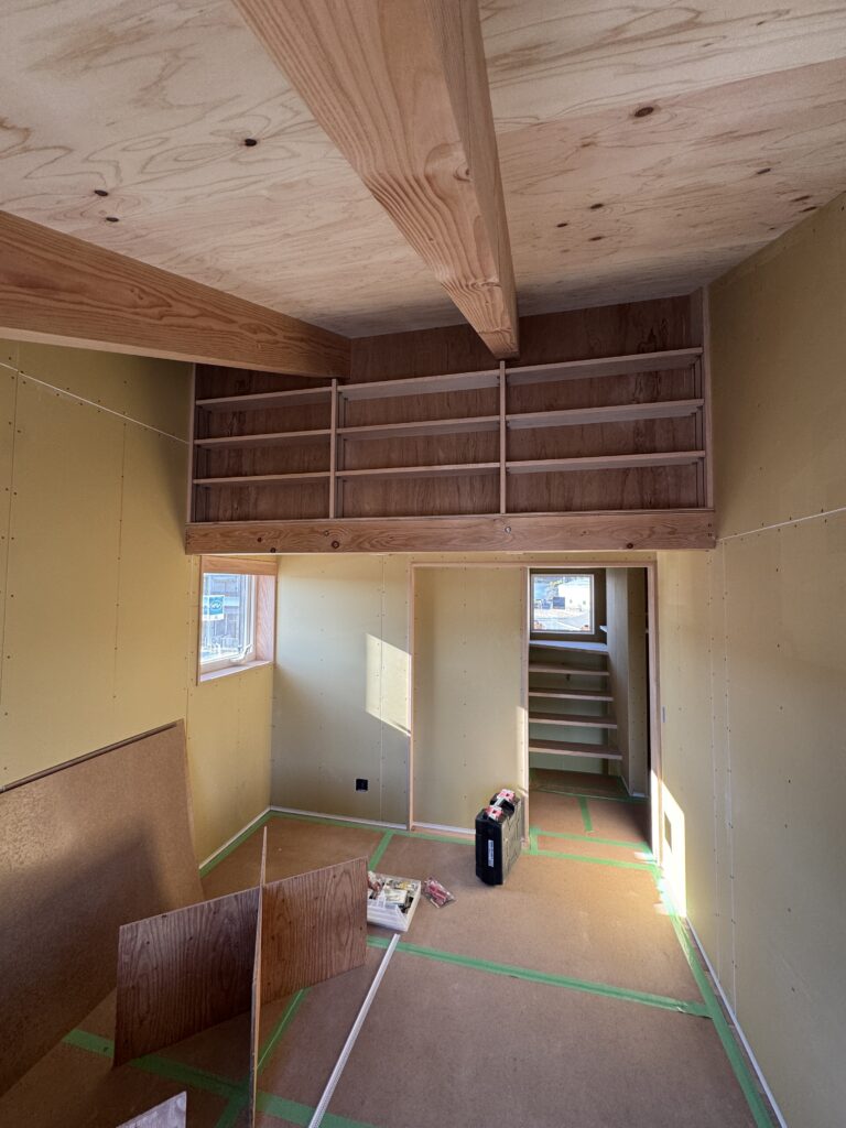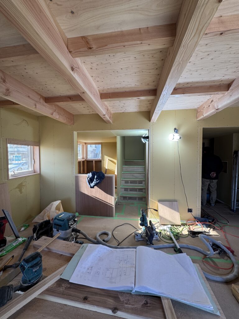 今回の物件は新築だけれども、使い込んだヴィンテージ感のある素材感へ仕上げますのでいつもの透明なオイル塗装以上に、あえて木部を白く塗りつぶしていくことでその雰囲気をだします。