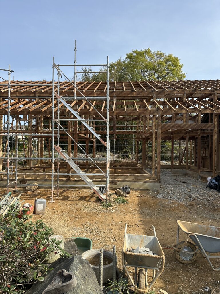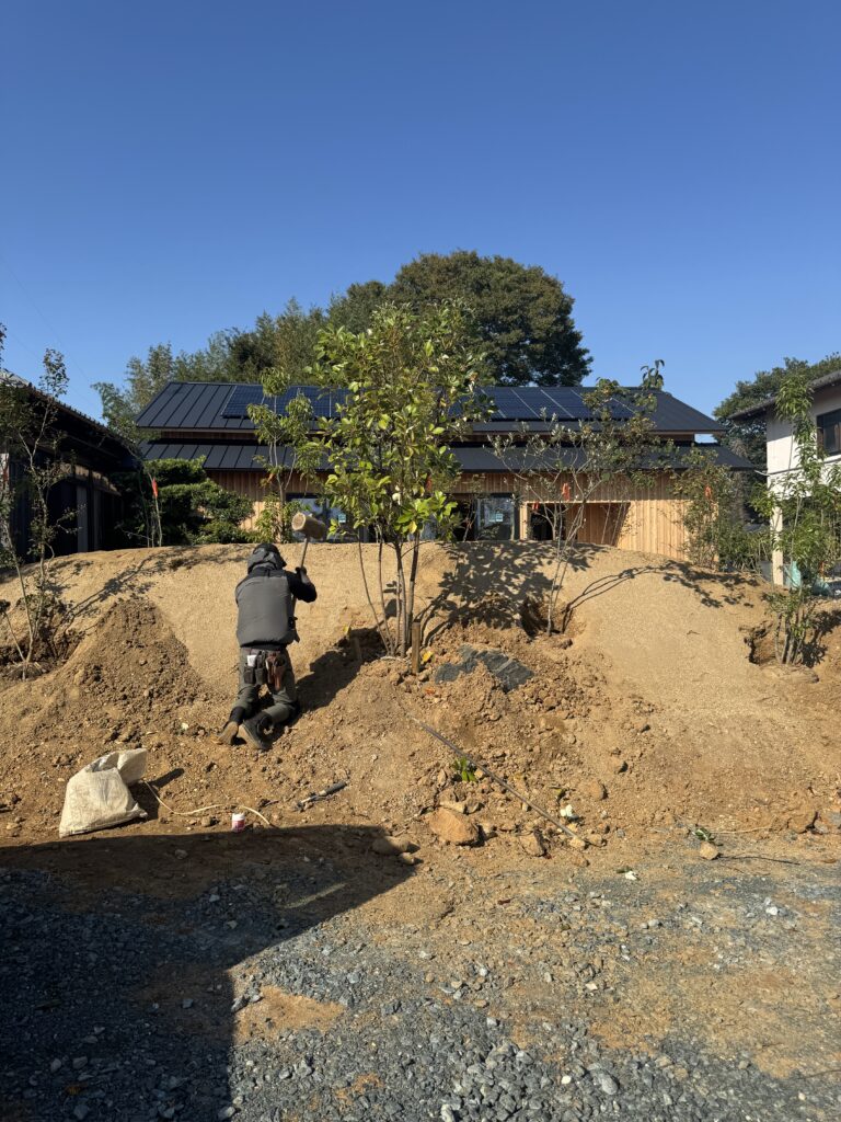 豊橋市の工務店。ニコハウス設計室代表で一級建築士の鈴木です。田原市でフルリノベ工事を施工させていただいているKさま邸。築55年の住まいを現代の高性能住宅に生まれ変わらせる工事です。建物の工事はおおむね終了し、造園工事が進んでいます。