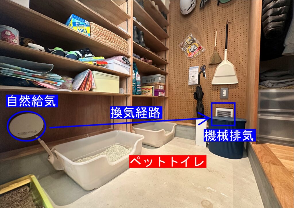 いつもホームページをご覧いただきありがとうございます。今回のテーマは『ペットトイレの臭い対策』です。高気密高断熱になって、室内の換気量がうまく調整できるようになった一方で、ペットを室内で飼っている方だと気になるのが『ペットのにおい』換気計画がしっかりしていると排出はできていると思うのですが、特にトイレについては注意が必要です。弊社で施工してとてもよかったやり方がありますのでペットを飼われる方のご参考になれば幸いです。 対策としてペットのトイレはなるべく給気側から遠く排気側に置く。このやり方をすると高気密高断熱住宅であれば室内が臭うことは少ないと思います。ただし計画換気がしっかりできていることが絶対条件で特に第三種換気といわれる、『排気は機械で行い、給気は自然給気』という計画の場合、機械と給気の関係性が1:1になっていません。わかりやすくお伝えすると排気の力が10として給気から10入ればいいのですが給気が少ないと排気同士でけんかして片方の排気が逆流するという状態がおきます。特にキッチンのレンジフードのような強力な風量をもった換気扇をつけるとそうなる傾向が強く、計画通りに換気できていないことはよくあります。各居室に自然給気をつけて…のようになんとなく計画している家はそんなにうまく換気できていません。 そこで弊社はこのように計画しました。