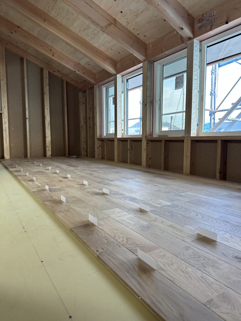 豊橋市の工務店。ニコハウス設計室代表で一級建築士の鈴木です。豊川市で施工中のTさま邸。弊社はスケルトンインフィルという構造をすっきり計画する方法を取っています。そのため床を貼る工事の頃はまだ間仕切り壁には柱が何もありません。