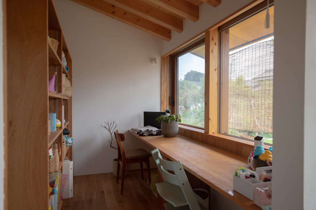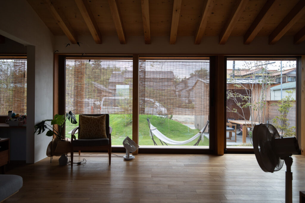 奥行きのあるリビングのソファからは築山のある庭の景色を,デッキに座ると遠くの森が見えるようになっており、人が座る場所の目線の先を意識しました。