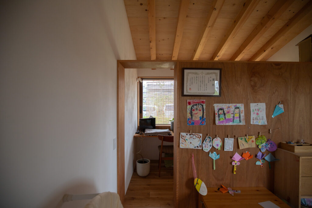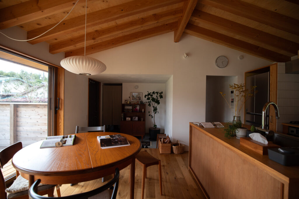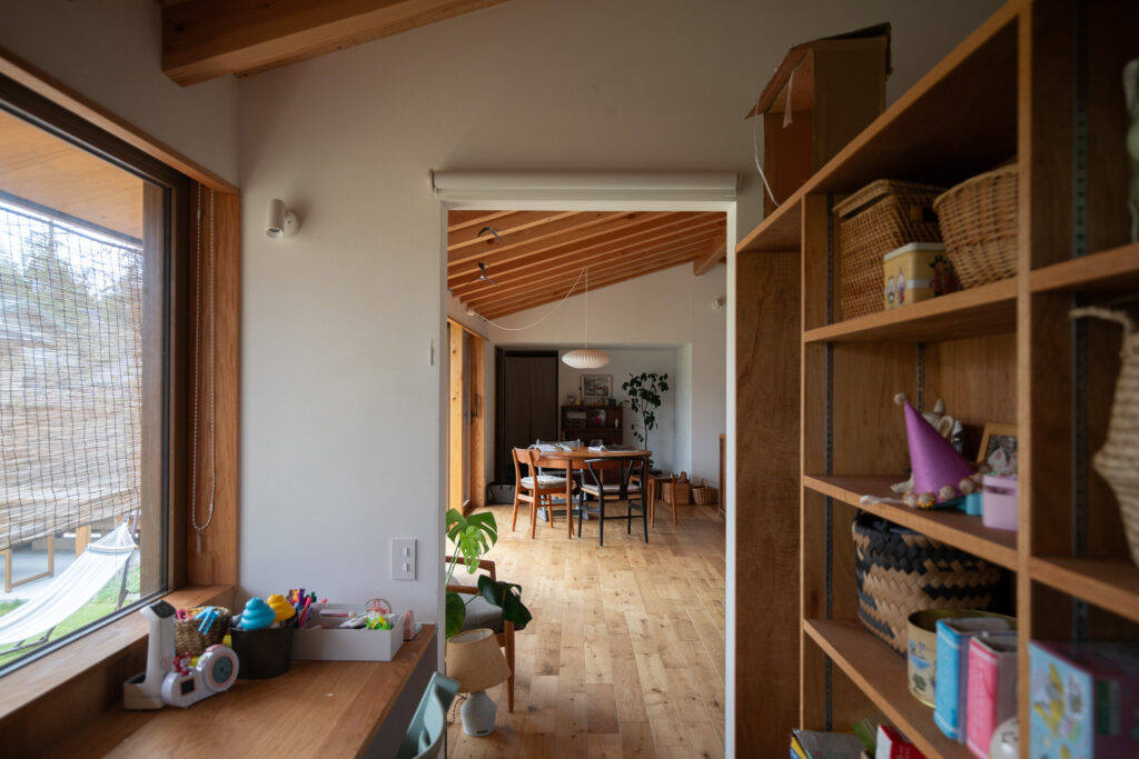 横に細長い建物を縦にザクザク切るように壁を配置し、切妻の屋根形状を生かした空間でシンプルな構造としました。
